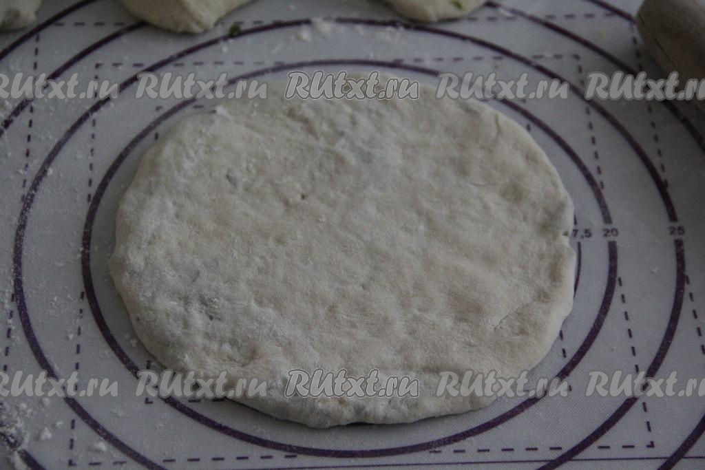Тесто разделить на 8 частей. Каждую часть теста раскатать на присыпанной мукой поверхности в лепёшку (тонко раскатывать не нужно).