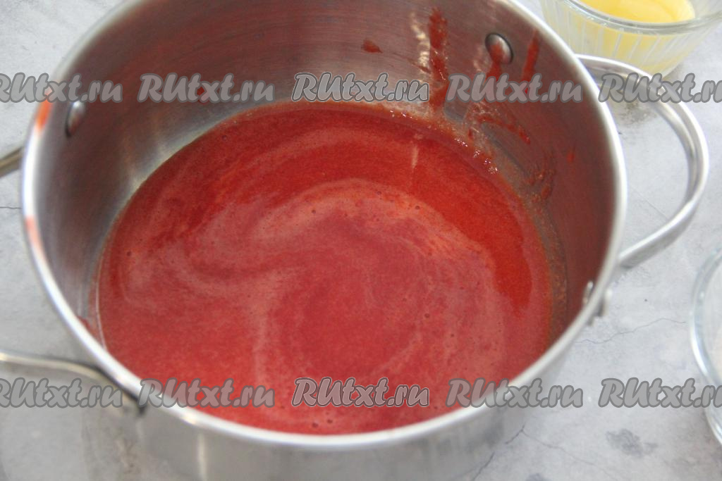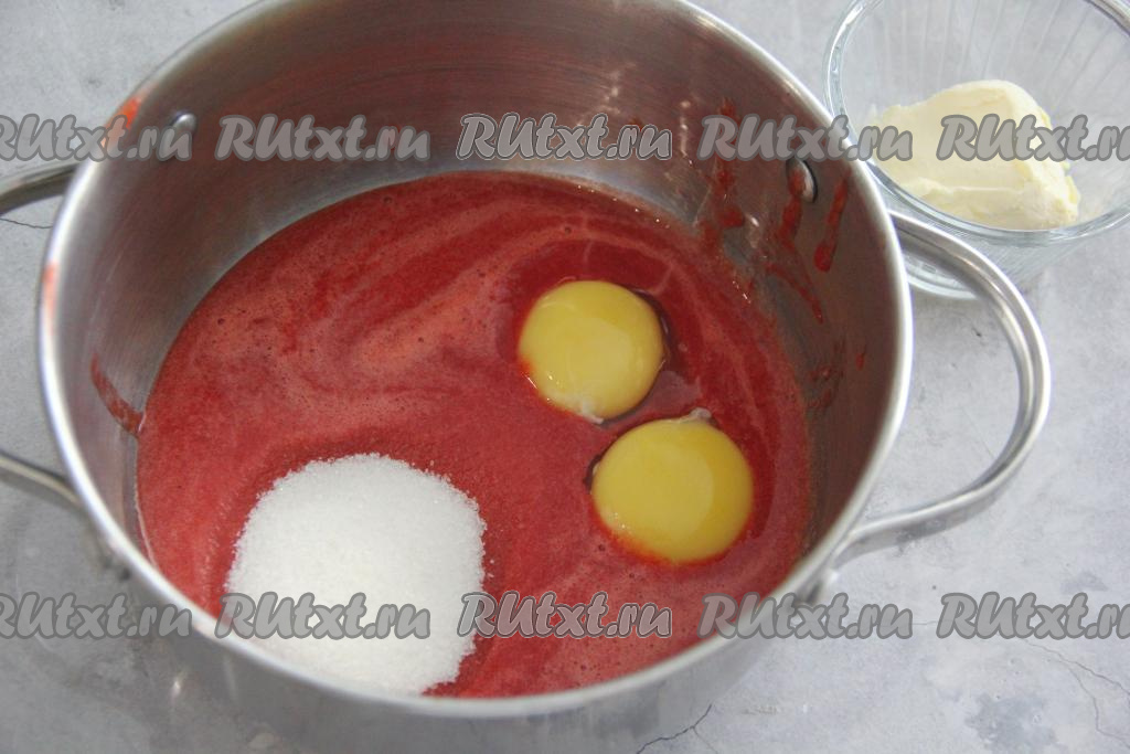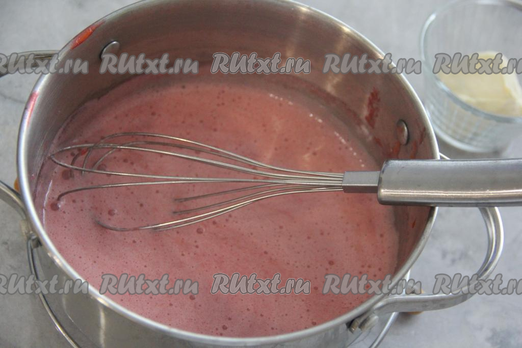 В сотейнике с толстым дном соединить процеженное клубничное пюре, сахар и желтки, перемешать венчиком, всыпать крахмал.
