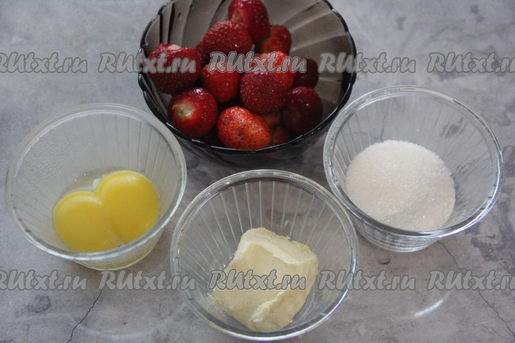 Подготовить продукты. Если клубника свежая, тогда её нужно промыть водой, удалить чашелистики. Если клубника замороженная, тогда её нужно разморозить, а лишнюю жидкость слить. Сливочное масло нужно заранее достать из холодильника, чтобы оно согрелось и стало мягким.