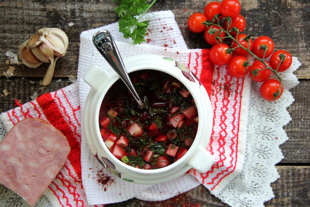 Подать вкусный и очень аппетитный холодный борщ с ветчиной к столу. Такое блюдо прекрасно насытит и освежит в жаркий день.