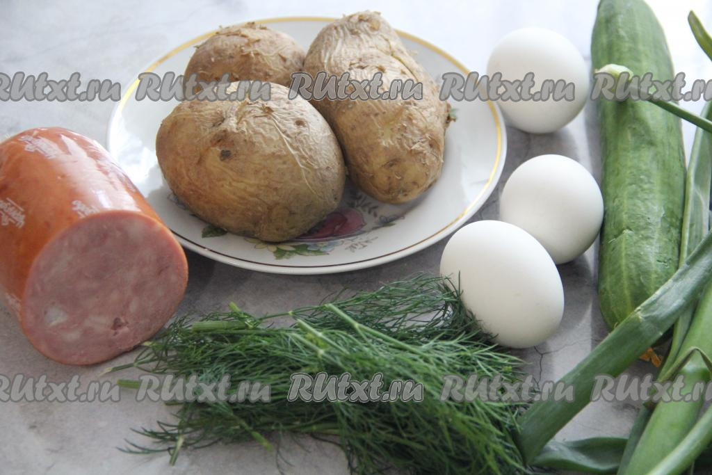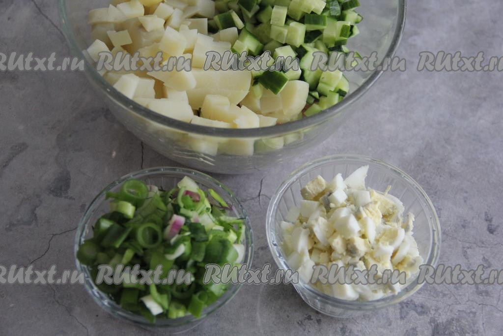 Пока бульон охлаждается, можно отварить до готовности в кожуре картошку (на это потребуется минут 25-30). Яйца сварить вкрутую (в течение 10 минут с момента закипания). Дать варёным яйцам и картофелю остыть. Зелень и огурец вымыть и обсушить.