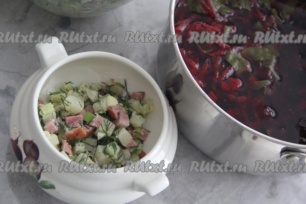 Перед подачей разложить смесь овощей и ветчины по тарелкам (примерно, по 4-5 столовых ложек на каждую тарелку). Затем залить свекольным бульоном (в каждую тарелку я вливаю, примерно, 1-2 половника). По желанию, можно добавить сметану или уксус.
