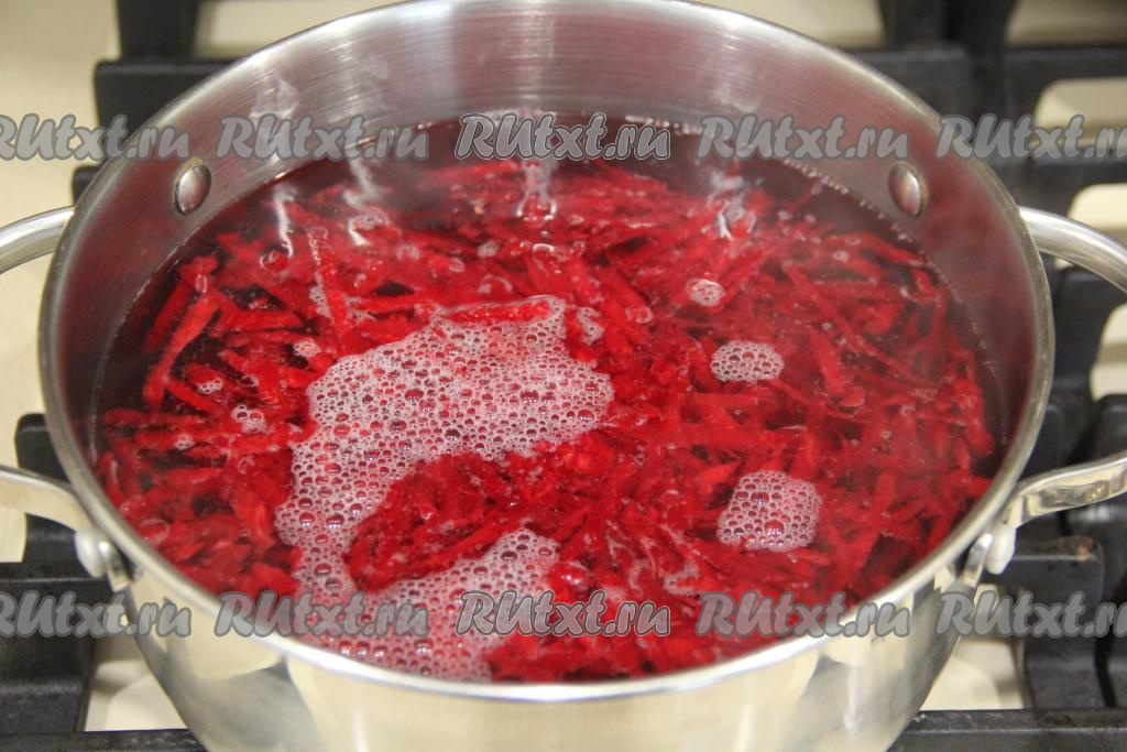 Сначала приготовим свекольную основу, для этого прежде всего очищенную свеклу нужно натереть на крупной тёрке. Я сварила свекольный бульон из свеклы с добавлением свекольной ботвой, но можно обойтись и без ботвы. Если используете ботву, то промойте её и нарежьте на полоски шириной 2 сантиметра. Влить в кастрюлю 2 литра воды, поставить на огонь, а после закипания добавить свеклу, снова дать закипеть, а затем варить свекольный бульон на небольшом огне 10-15 минут (свекла должна стать достаточно мягкой).