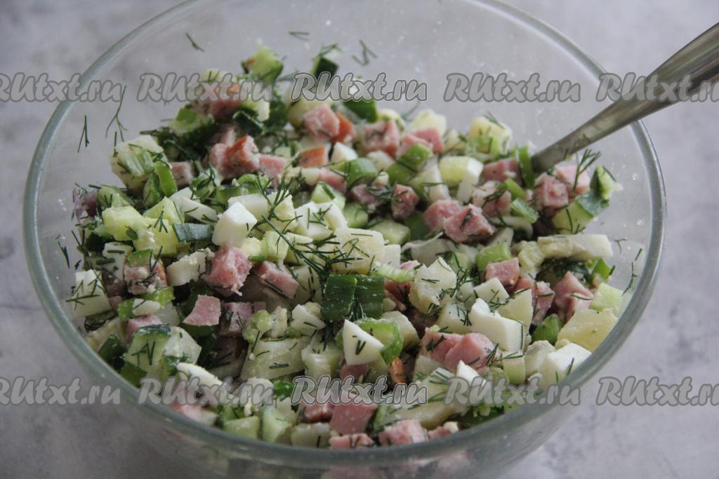 Соединить в миске картошку, огурцы, ветчину, зелень и яйца, слегка посолить.