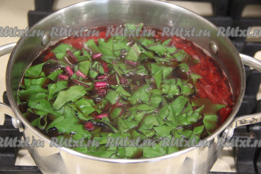 Затем в кастрюлю со свеклой добавить ботву и варить 2 минуты. Посолить по вкусу, довести до кипения, снять свекольный бульон с огня и полностью остудить. После того как бульон остынет до комнатной температуры, поставить кастрюлю в холодильник, чтобы бульон хорошо охладился.