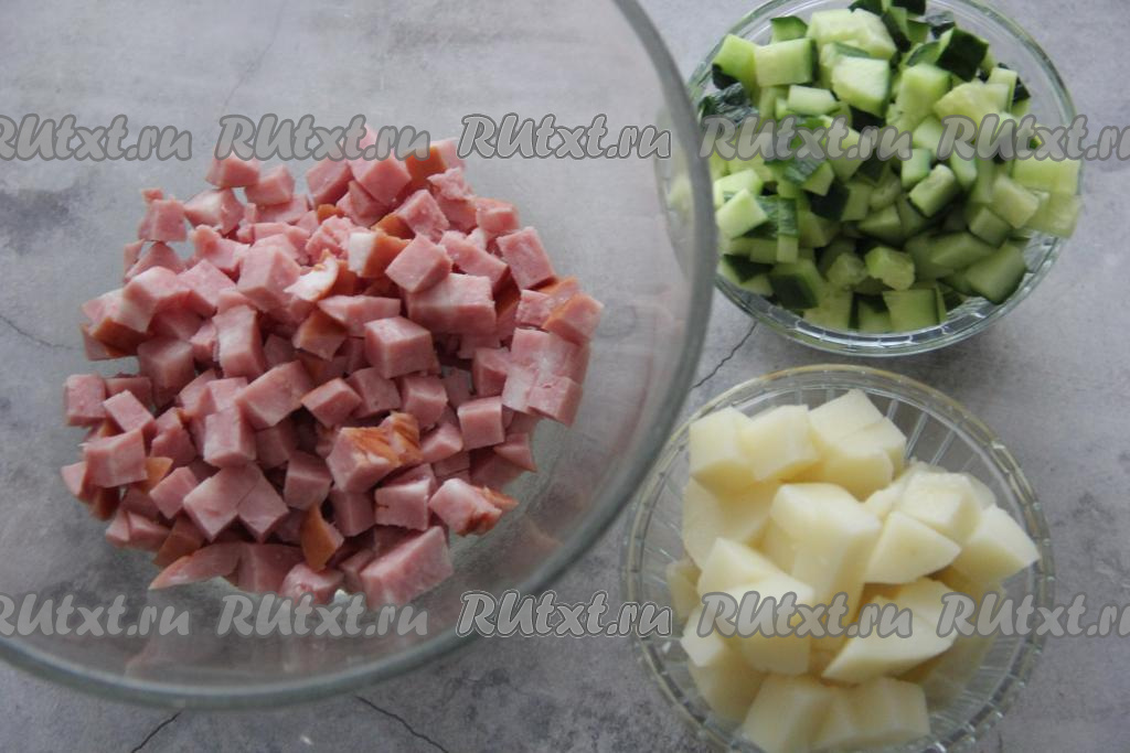 Картошку очистить от кожуры. Нарезать на средние кубики огурец, картошку и ветчину.