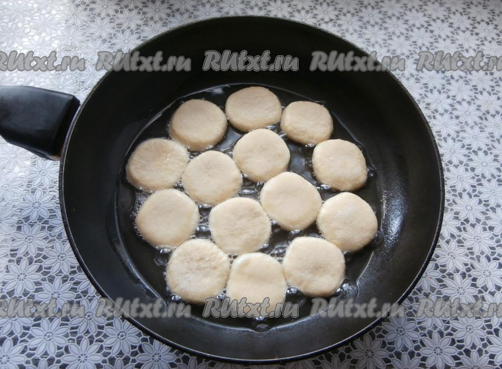 Хорошо разогреть в сковороде растительное масло, выложить заготовки пончиков и жарить их до румяности на среднем огне.