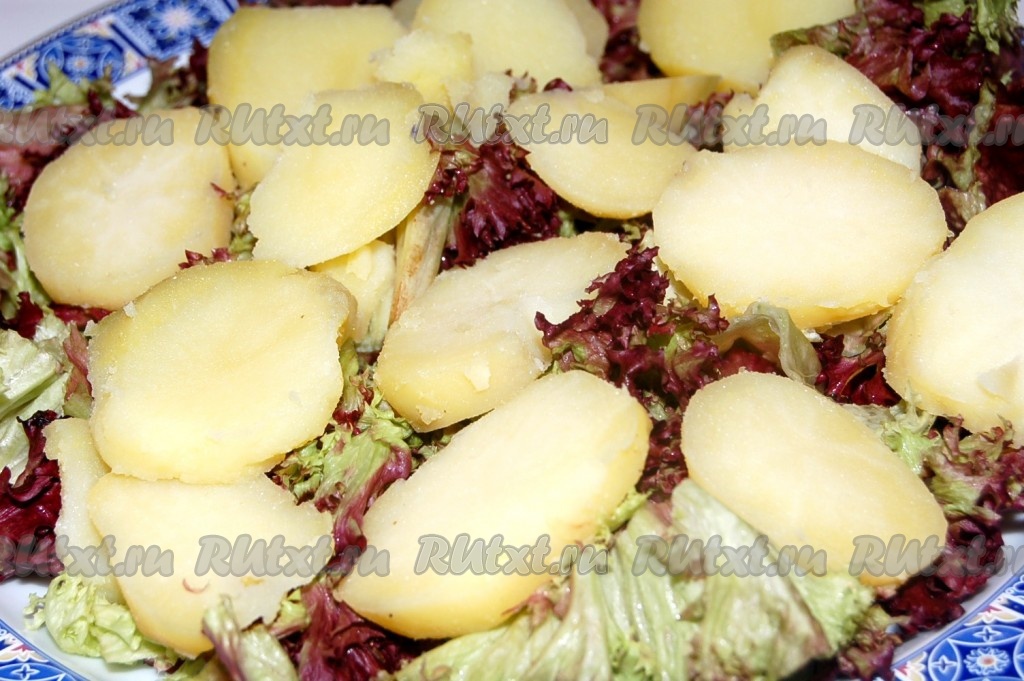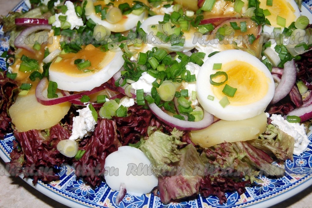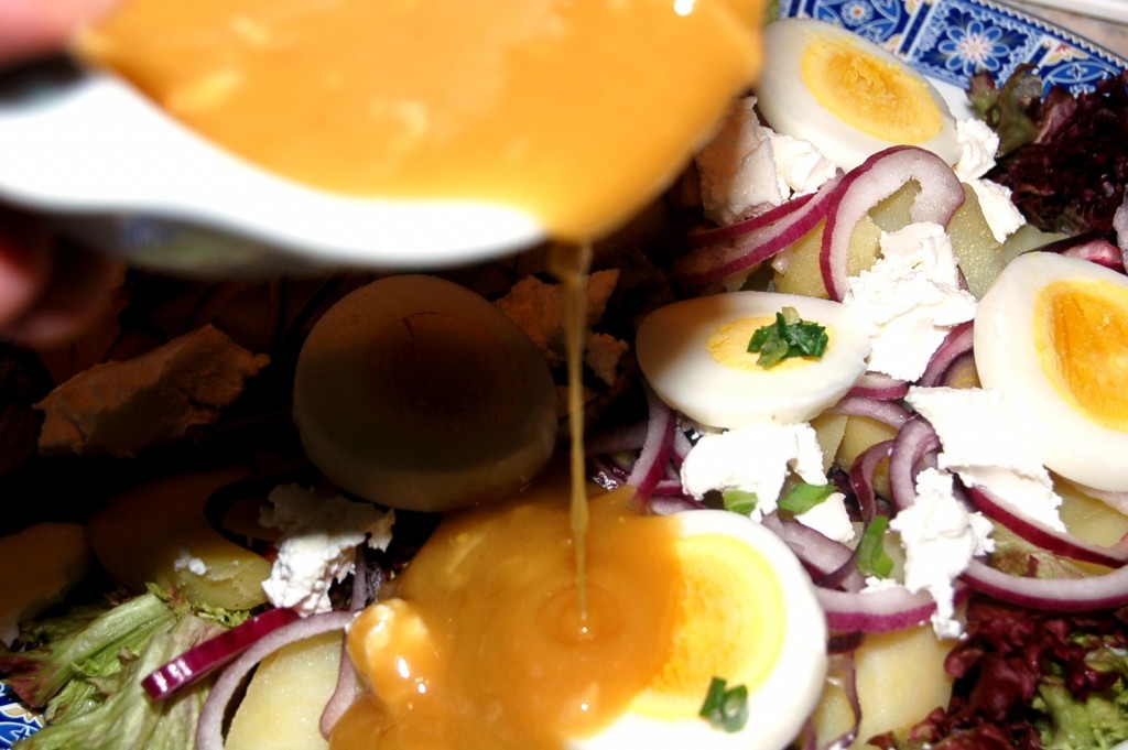 Эта горчичная заправка идеально подойдет для заправки соленой сельди, отварной рыбы, запеченной свинины и ко многим другим блюдам. Такой заправкой очень вкусно заправлять овощные салаты, в состав которых входит теплый картофель. Нарезать овощи (салат листовой, картофель, лук репчатый, лук зеленый, яйца), выложить их на блюдо слоями.
