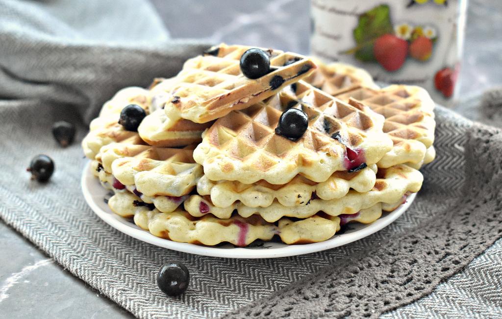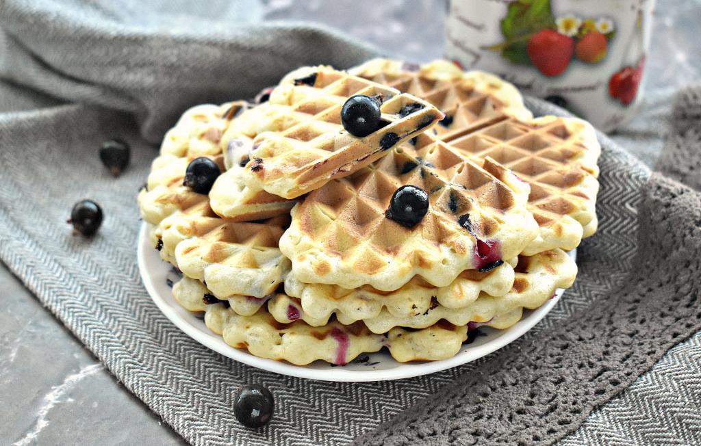 Чтобы приготовить венские вафли с ягодами в электровафельнице понадобится минимальный состав ингредиентов. В качестве ягодной начинки я взяла чёрную смородину, подойдёт также вишня без косточек или черника, красная смородина, нарезанная кусочками клубника. По этому рецепту вафли получаются мягкими, вкусными и нежными. Предложить к столу вафли лучше с чашечкой горячего чая или кофе.