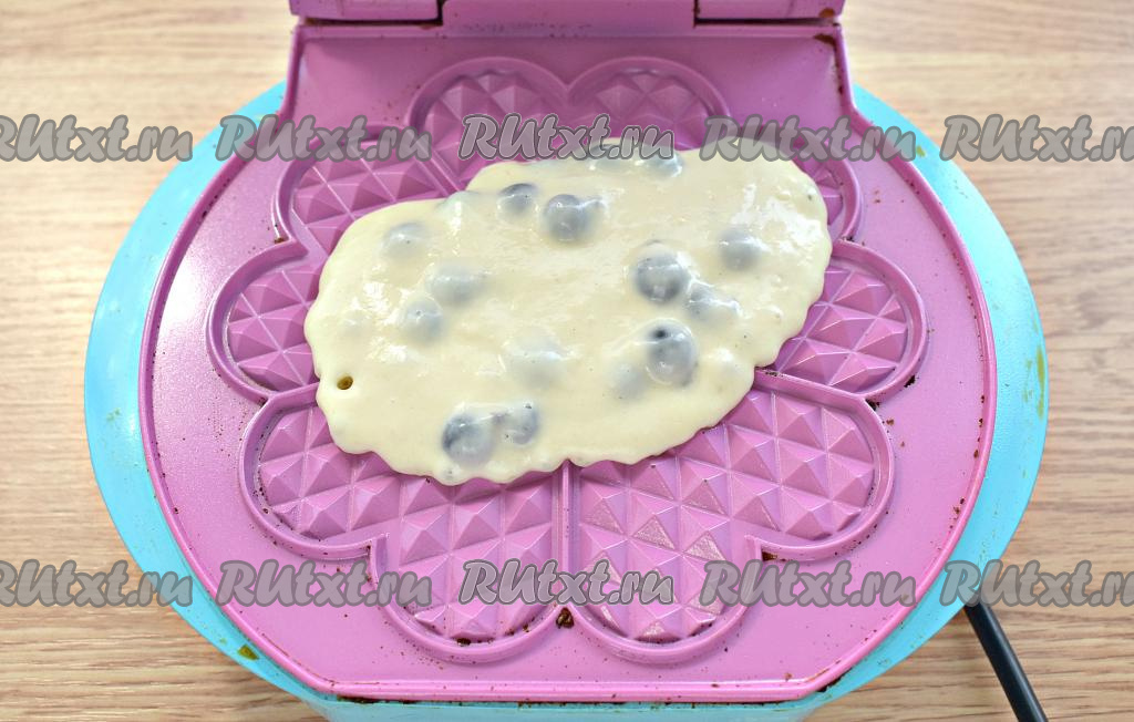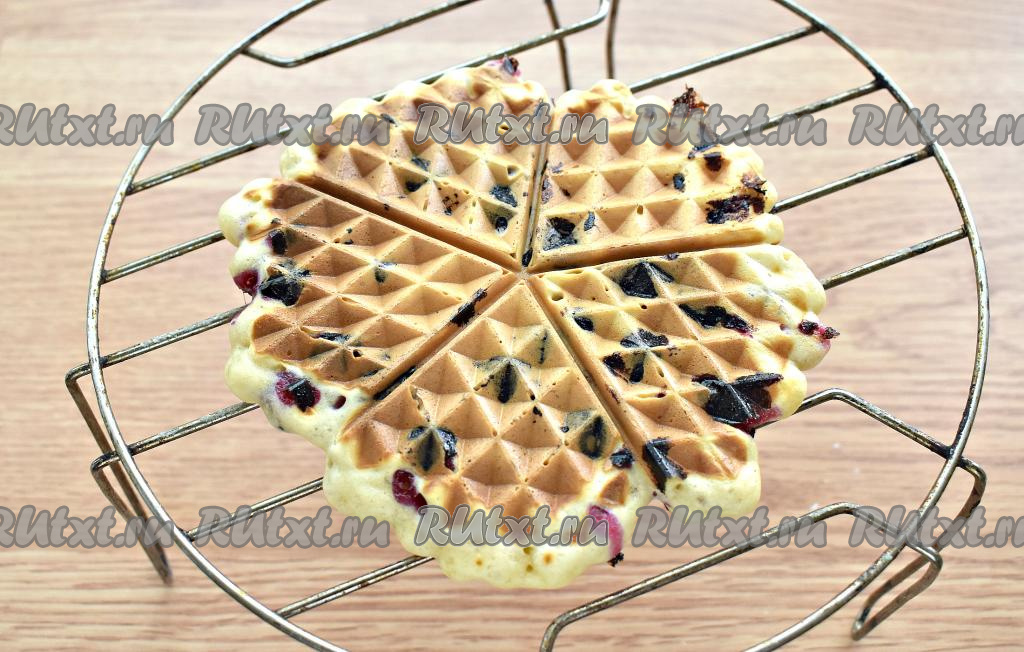 Вафли с ягодами выпекаем 2,5-3 минуты, а затем остужаем на решётке. В моей электровафельнице у меня вышло 25 штук.