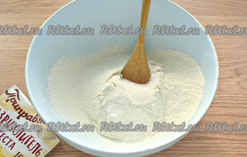 В миску просеиваем пшеничную муку, добавляем к ней сахар и разрыхлитель для теста, перемешиваем.