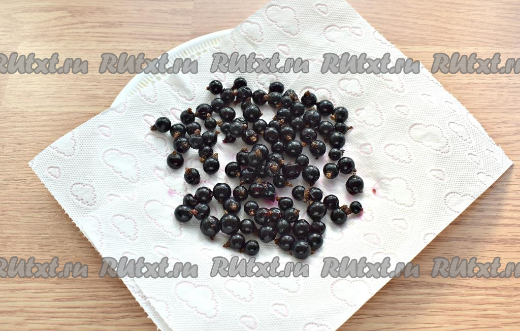 В первую очередь подготовим ягоды. Ягоды (я взяла чёрную смородину) перебираем, удаляем листочки, мусор, веточки и тщательно промываем под проточной водой. Чтобы с ягод удалить лишнюю влагу, перекладываем их на бумажные полотенца. Затем приступаем к замешиванию теста.