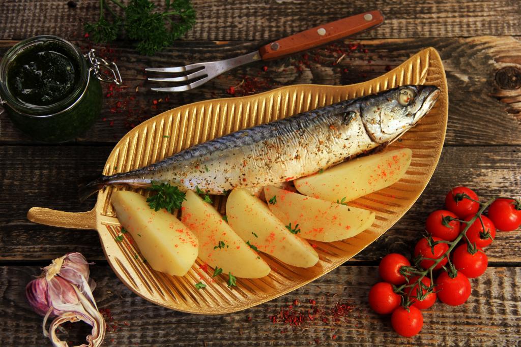 Достать противень с рукавом из духовки. Аккуратно разрезать рукав, а затем переложить скумбрию с картошкой на тарелку и в горячем виде подать к столу. Рыбка получается нежной, ароматной, а дольки картошки становятся мягкими, пропитанными рыбными соками. Всем советую этот простой рецепт приготовления вкусного и сытного блюда!