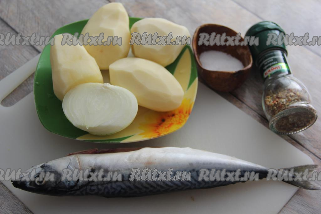 Подготовить продукты. Замороженную скумбрию полностью разморозить при комнатной температуре, затем отрезать голову, плавники и хвост, удалить из брюшка внутренности вместе с чёрной плёночкой, тщательно промыть рыбку и обсушить. Картошку и лук почистить.