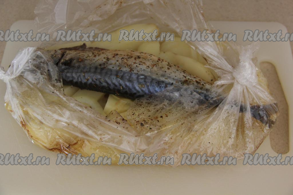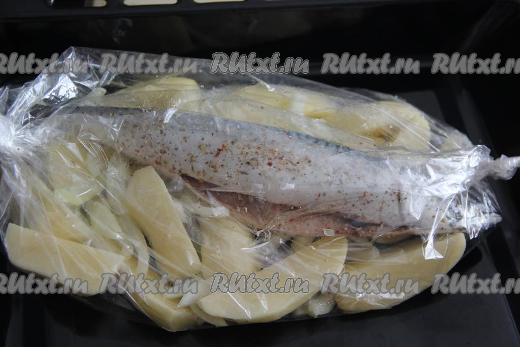 Картошку с луком поместить в рукав для запекания, поверх овощей выложить скумбрию, завязать рукав с двух сторон и переложить на противень. Сделать несколько проколов зубочисткой вверху рукава. Поставить противень с рукавом в разогретую духовку.