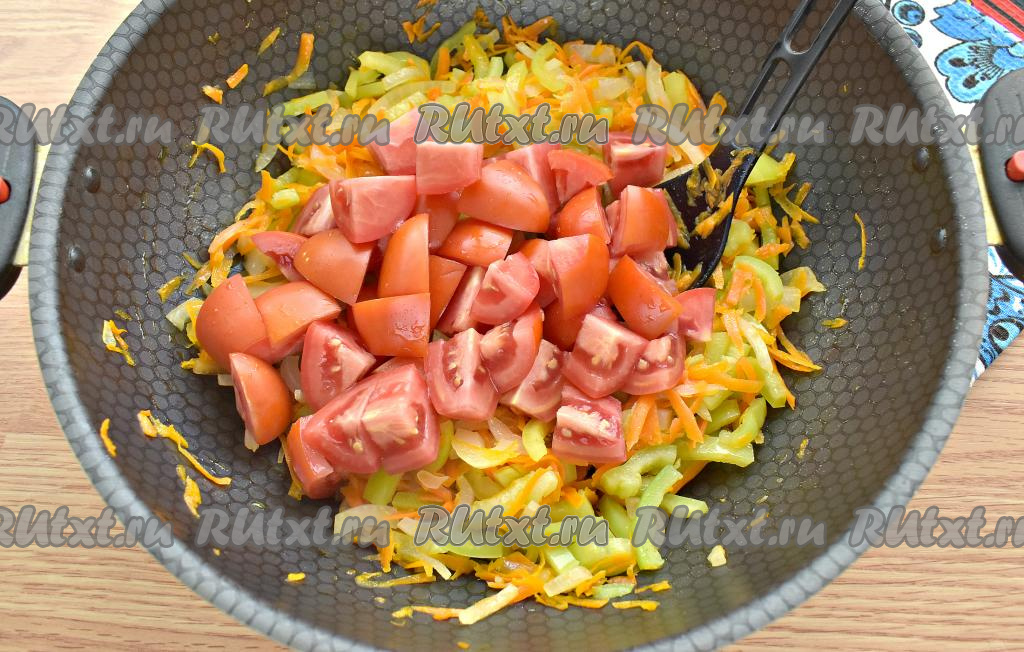 Затем выкладываем помидоры, нарезанные на крупные кусочки, перемешиваем и обжариваем овощи минут 5, помешивая.