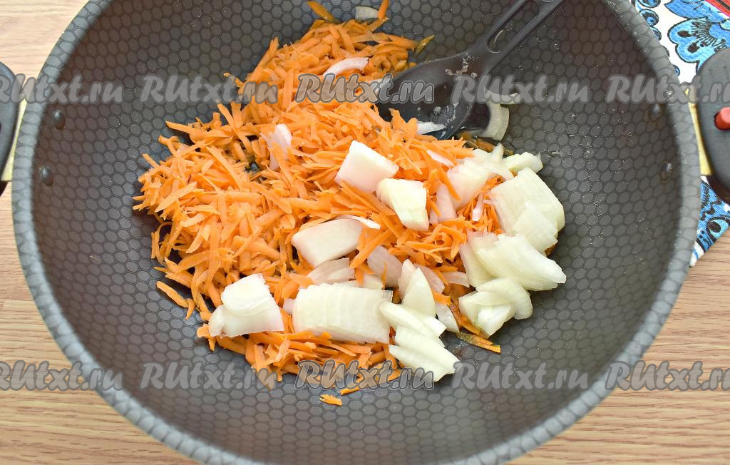 Очищаем морковку, чеснок и лук. В глубокую сковороду (сотейник или казан) наливаем растительное масло, выкладываем морковку, натёртую на крупной тёрке, и нарезанный на четверть кольца лук, обжариваем на среднем огне минут 5, помешивая.