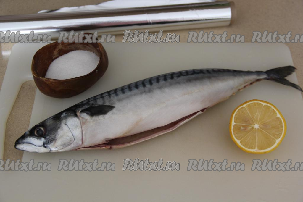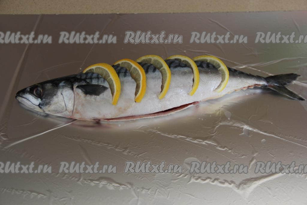 Подготовить продукты. Скумбрию полностью разморозить, удалить внутренности, не забывая вынуть из брюшка чёрную плёночку, промыть водой, затем обсушить. Взять половину вымытого лимона, отрезать 2-3 тонких кружочка, которые нужно разрезать пополам. Натереть скумбрию внутри и снаружи солью. Из оставшейся части лимона выдавить сок, поливая рыбку внутри и снаружи.