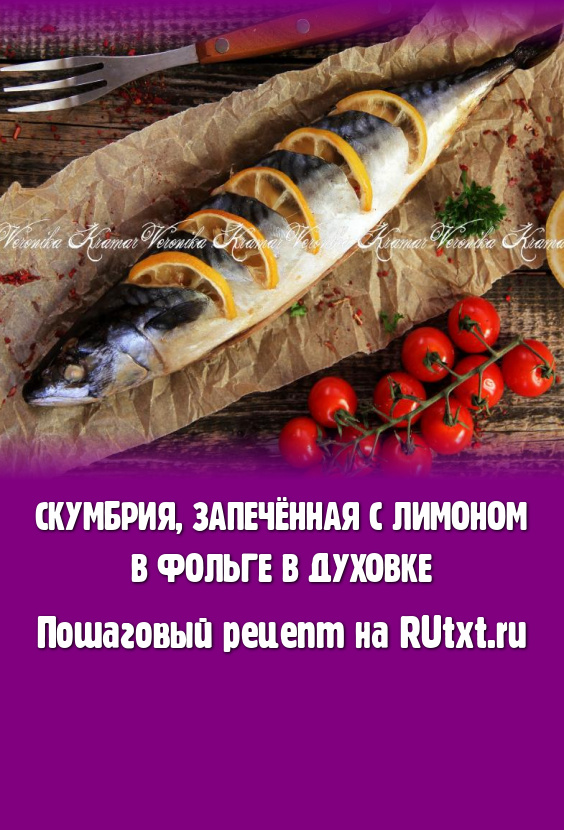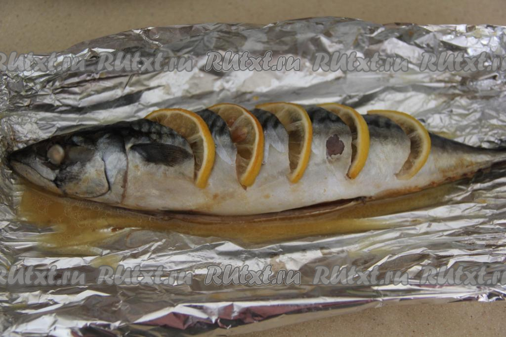 Плотно завернуть скумбрию с лимоном в фольгу и выложить на противень. Запекать скумбрию в фольге в разогретой духовке минут 35 при температуре 180 градусов.