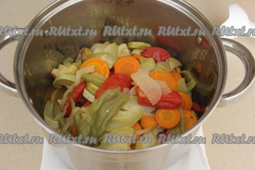 Аккуратно разрезать рукав и переложить овощи вместе с выделившимся соком в кастрюлю.
