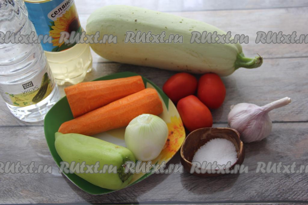 Подготовить продукты. Лук, чеснок и морковку почистить. У кабачка удалить "хвостики" с двух сторон, жёсткую кожуру нужно срезать (я брала кабачок с тонкой кожицей, поэтому её не срезала), если семечки крупные - их тоже нужно удалить. Взвесить подготовленный кабачок, нам понадобится 1 килограмм. Из перца удалить плодоножку и семена. Все овощи промыть.