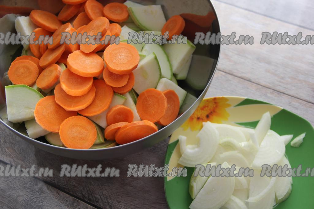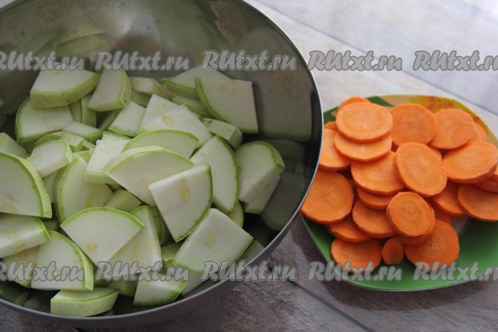 Кабачок нарезать на средние кусочки, морковку - на кружочки.