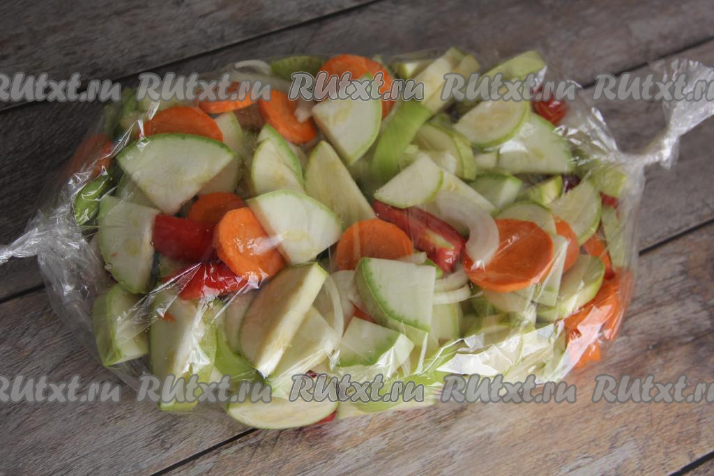 Рукав с готовыми овощами (морковка и кабачок должны стать мягкими, легко прокалываться вилкой) достать из духовки.