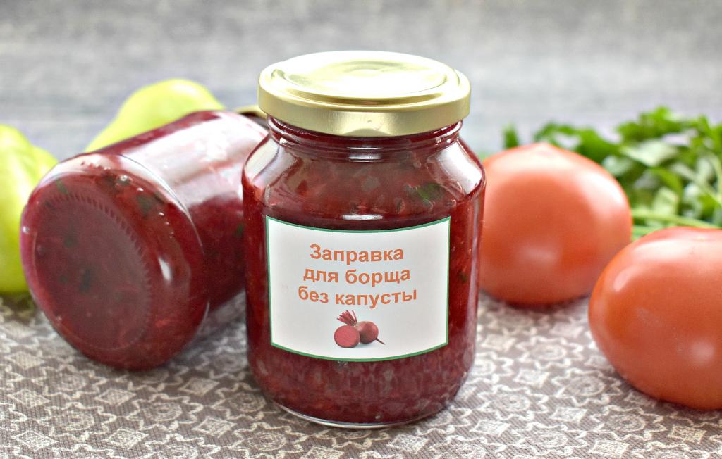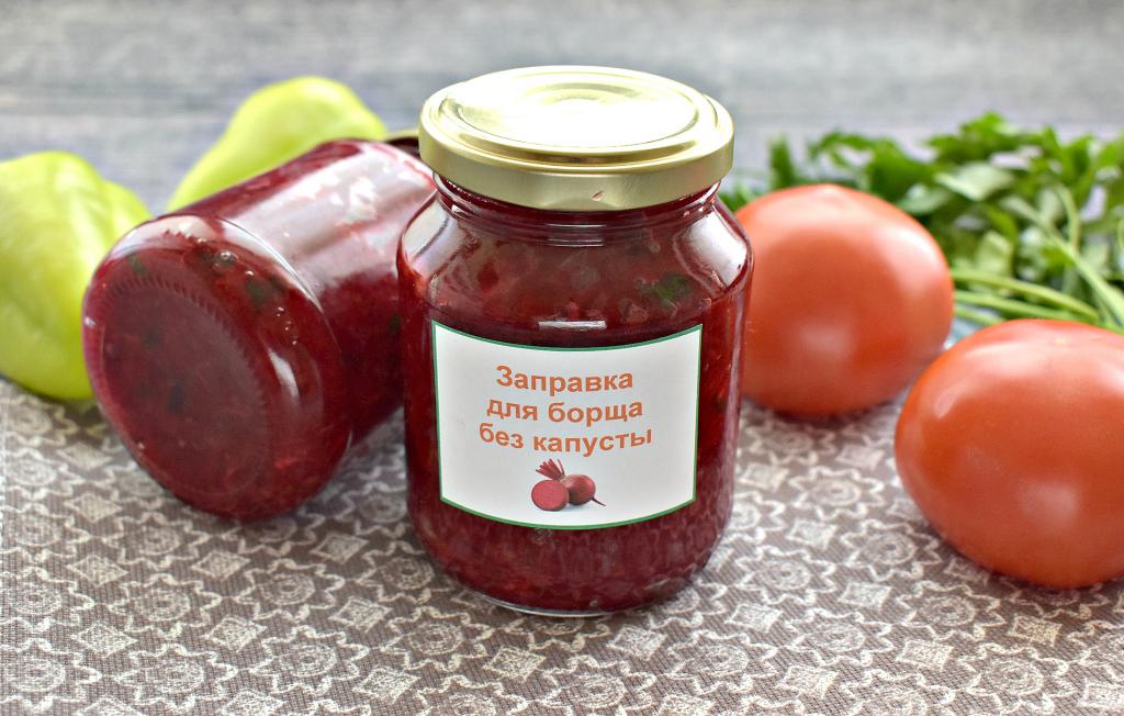Горячую заправку для борща сразу раскладываем по простерилизованным банкам, закручиваем (или закатываем) предварительно прокипячёнными крышками, переворачиваем, ставя на крышку. Укутываем заготовку со всех сторон в одеяло (или плед), а после остывания (примерно через сутки) убираем на хранение в прохладное место.