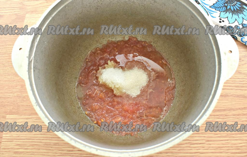 Вливаем в томатную массу 40 миллилитров растительного масла, всыпаем сахар и соль, перемешиваем.