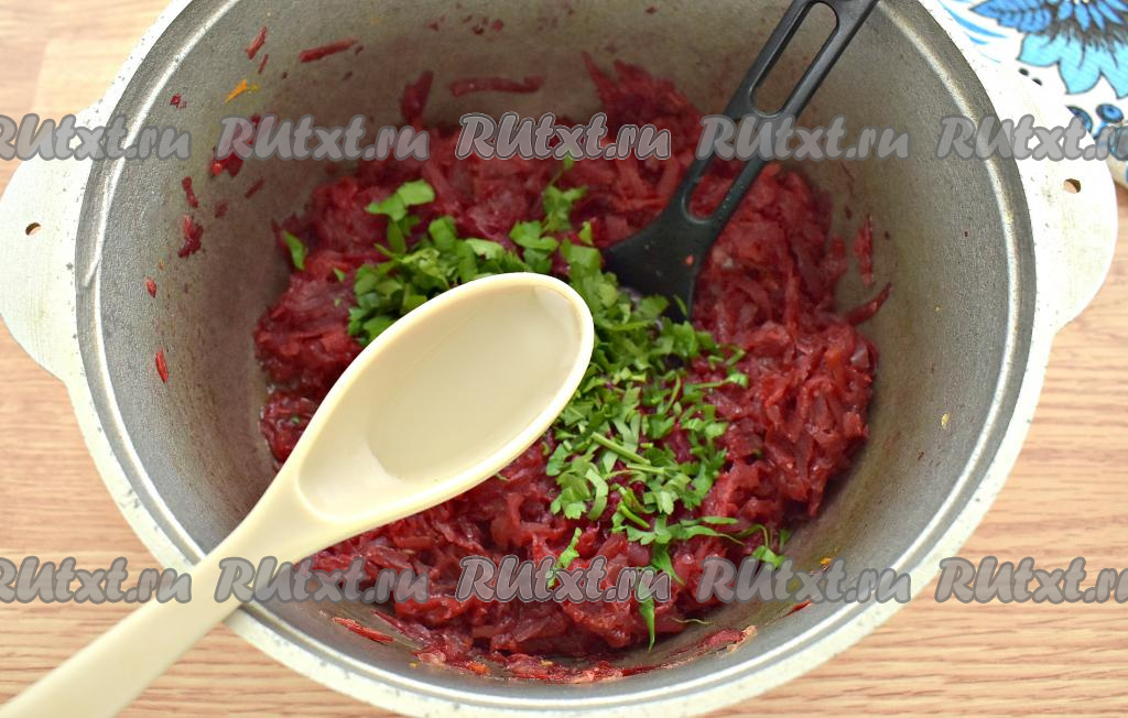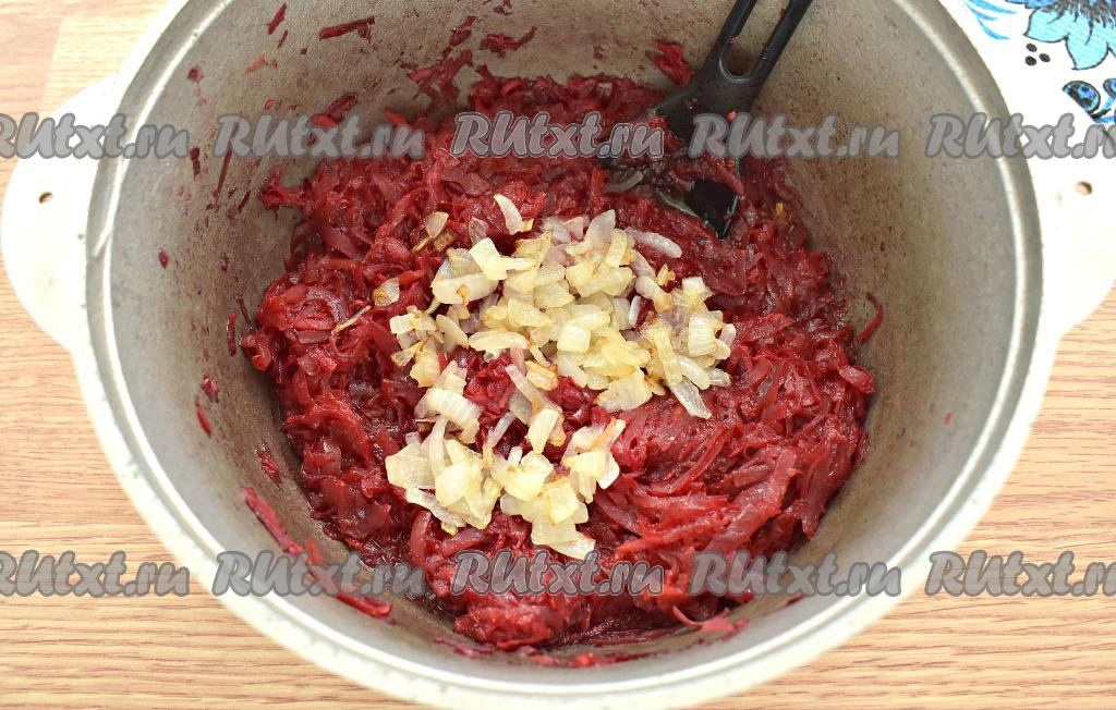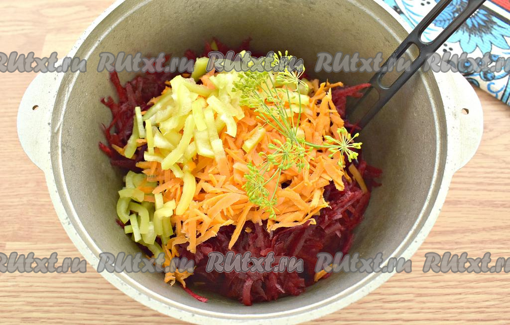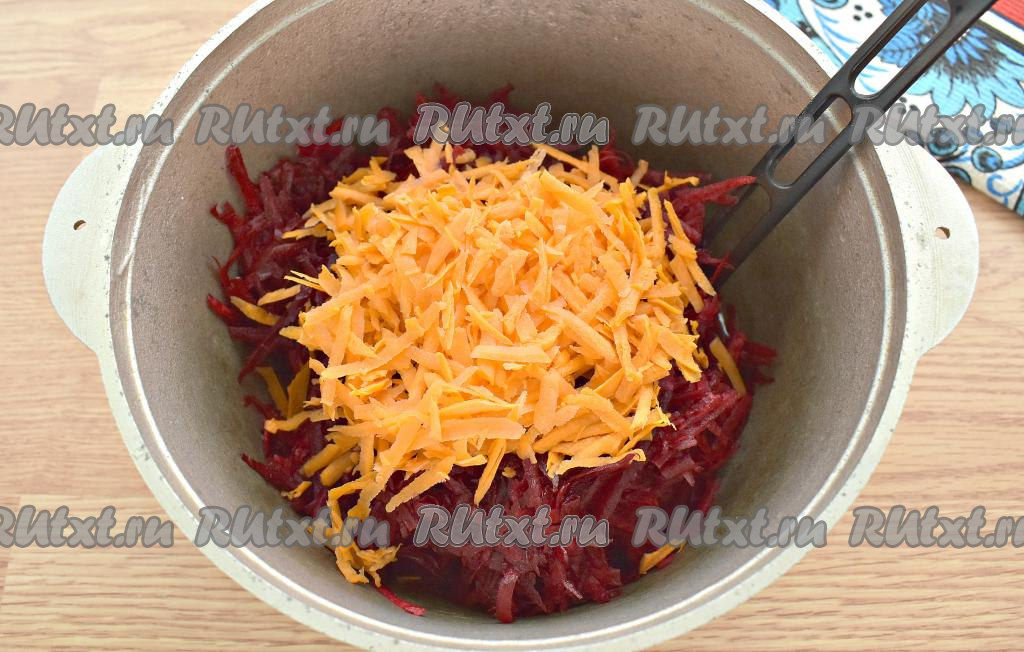 Сюда же добавляем морковку и свеклу, натёртые на крупной тёрке.