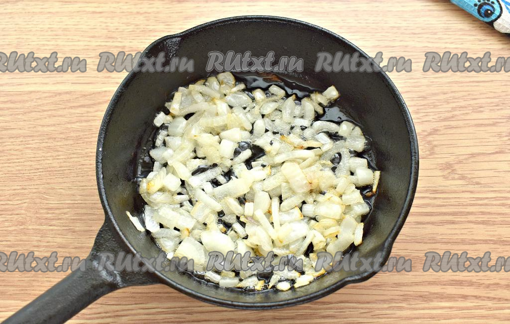 Овощи хорошо перемешиваем, доводим на умеренном огне до кипения, а затем тушим на слабом огне 15 минут, периодически перемешиваем. Вливаем в сковороду 20 миллилитров растительного масла, выкладываем достаточно мелко нарезанный лук и обжариваем его на среднем огне, помешивая, до мягкости (на это потребуется минут 5-6), убираем с огня.