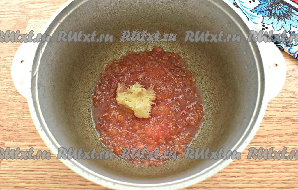 Очищаем лук, свеклу, чеснок и морковь, моем. Удаляем семенную коробку с плодоножкой из болгарского перца, промываем, убирая оставшиеся семечки. Моем помидоры, вырезаем место, в котором росла плодоножка. По желанию, заливаем помидорчики кипятком, отставляем на 3-5 минут, а затем заливаем их холодной водой и снимаем шкурку. Помидоры пропускаем через мясорубку (или пробиваем блендером, или натираем на тёрке). Томатную массу перекладываем в казан (сотейник или кастрюлю), добавляем пропущенный через пресс (или мелко нарезанный) чеснок.