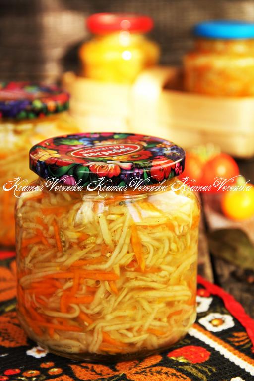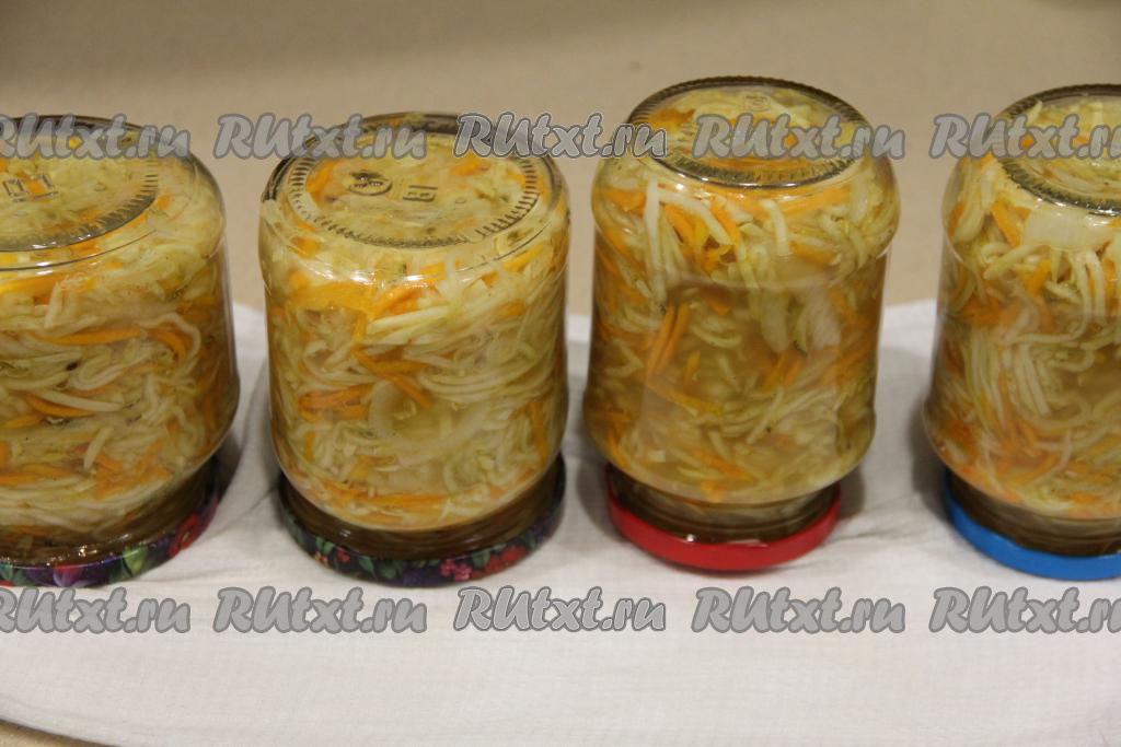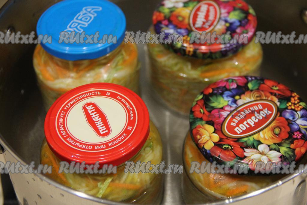 Разложить закуску по тщательно вымытым банкам (баночки можно не стерилизовать), равномерно распределить выделившийся сок. Банки с закуской накрыть заранее прокипячёнными крышками (я прокипятила крышки с момента закипания воды в течение 5 минут).