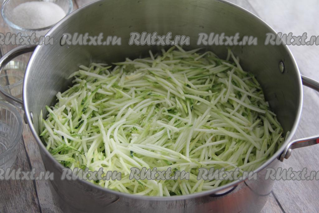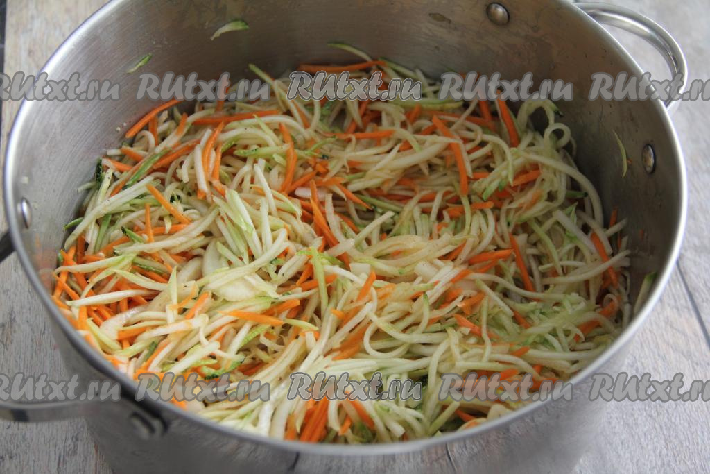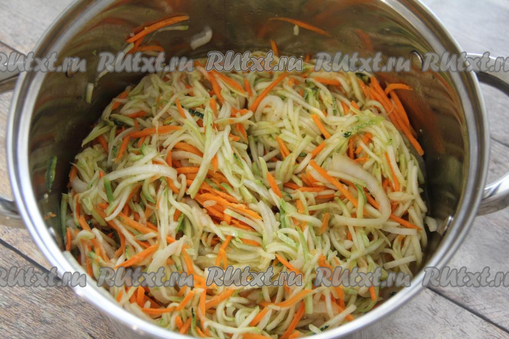 Натереть подготовленный кабачок на тёрке для корейской моркови, выложить в кастрюлю.
