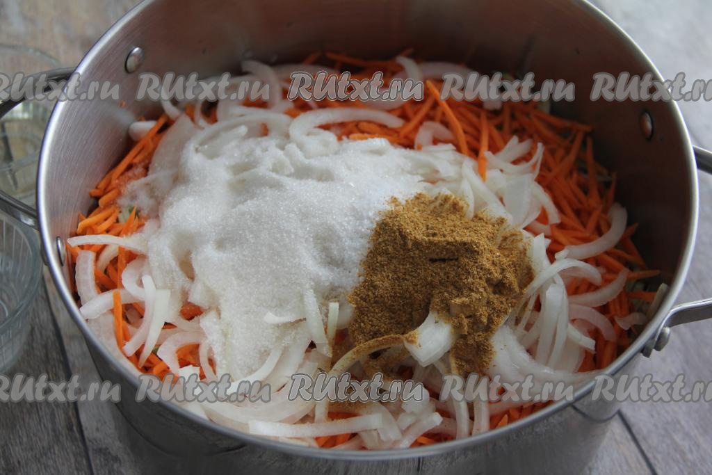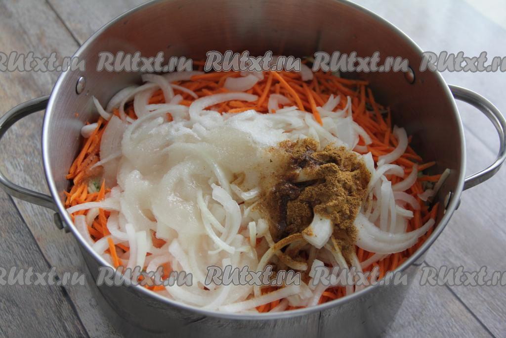 Всыпать сахар, приправу для моркови по-корейски и соль.