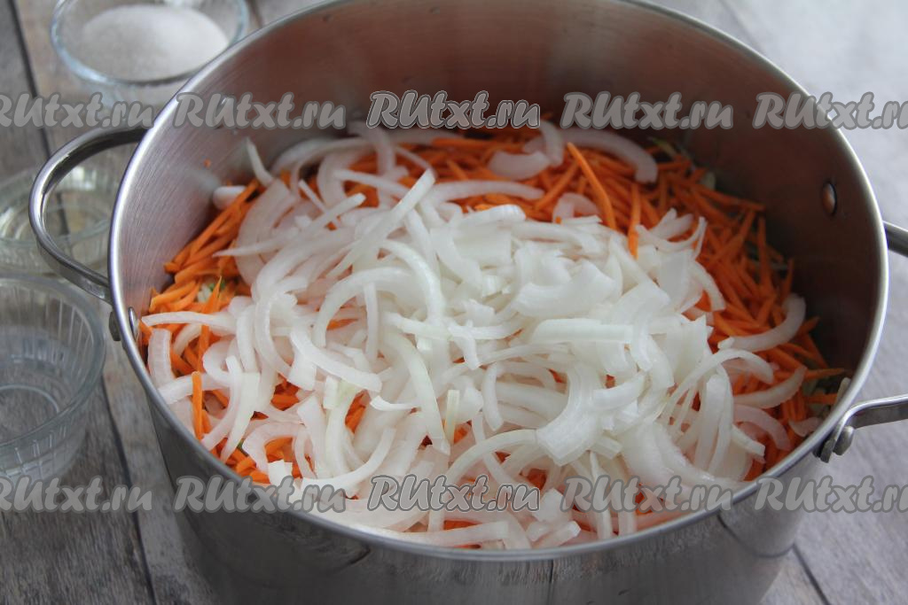 Лук нарезать на тонкие полукольца и переложить в кастрюлю с овощами.