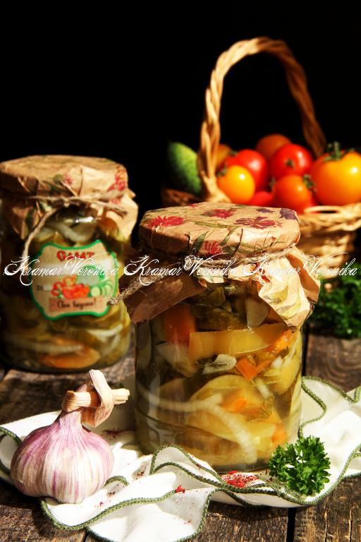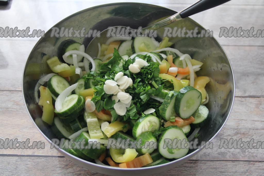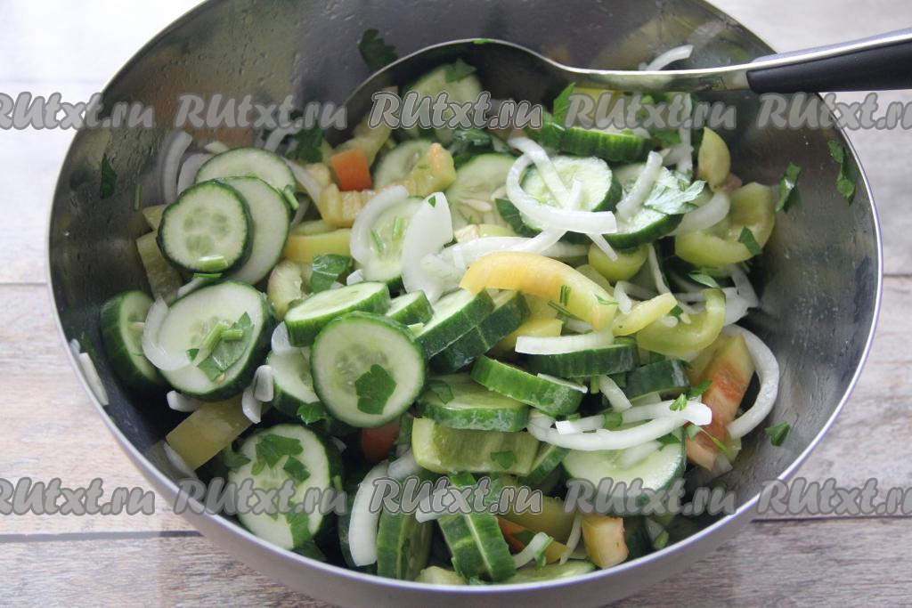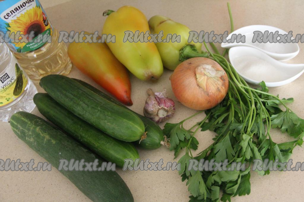 Зимой этот вкусный салат с приятно похрустывающими огурцами, болгарским перцем и луком станет отличным дополнением к различным блюдам.