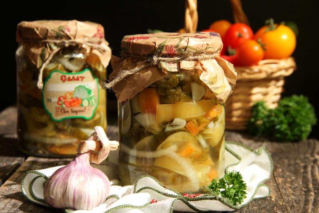 Затем аккуратно достать банки с салатом, закрутить (или закатать) их крышками, поставить вверх дном, укутать в одеяло, оставить баночки до полного остывания, а затем переставить на хранение в прохладное место (например, в кладовку или погреб).