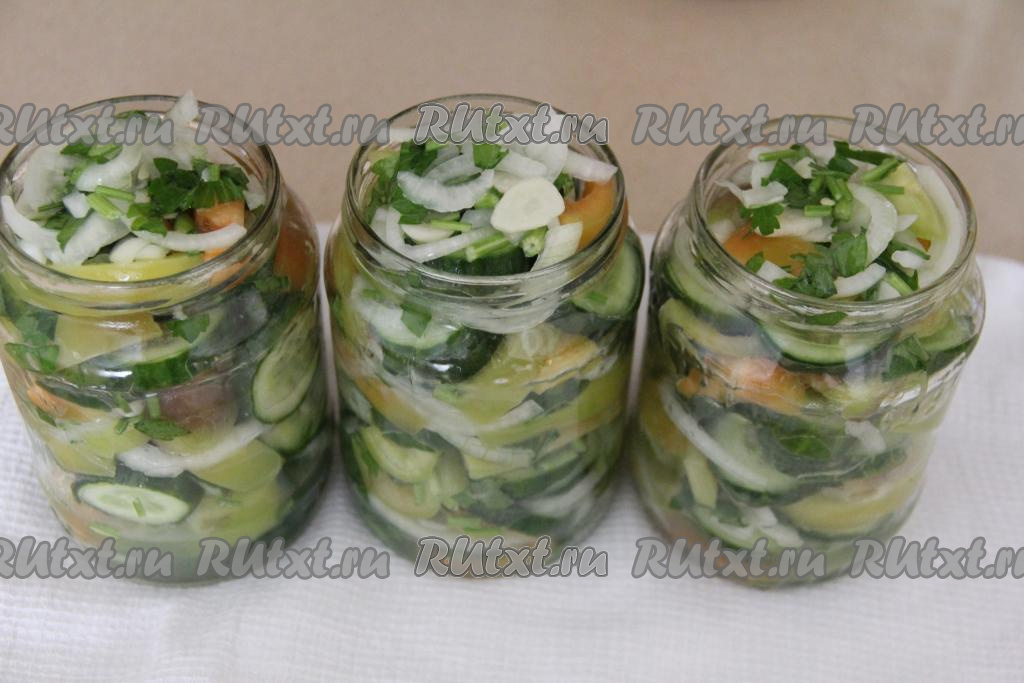 Разложить салат по подготовленным баночкам. Выделившийся сок от овощей равномерно разлить по банкам. Накрыть банки с салатом прокипячёнными крышками.
