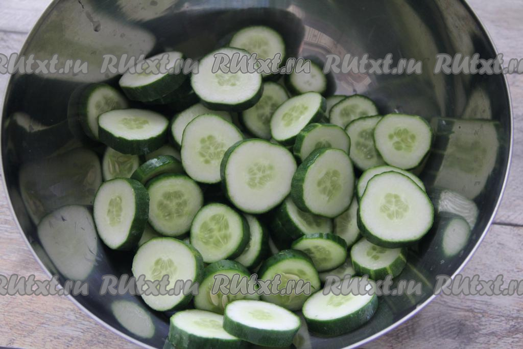 Огурцы нарезать на тонкие кружочки, выложить в глубокую миску (или в кастрюлю).