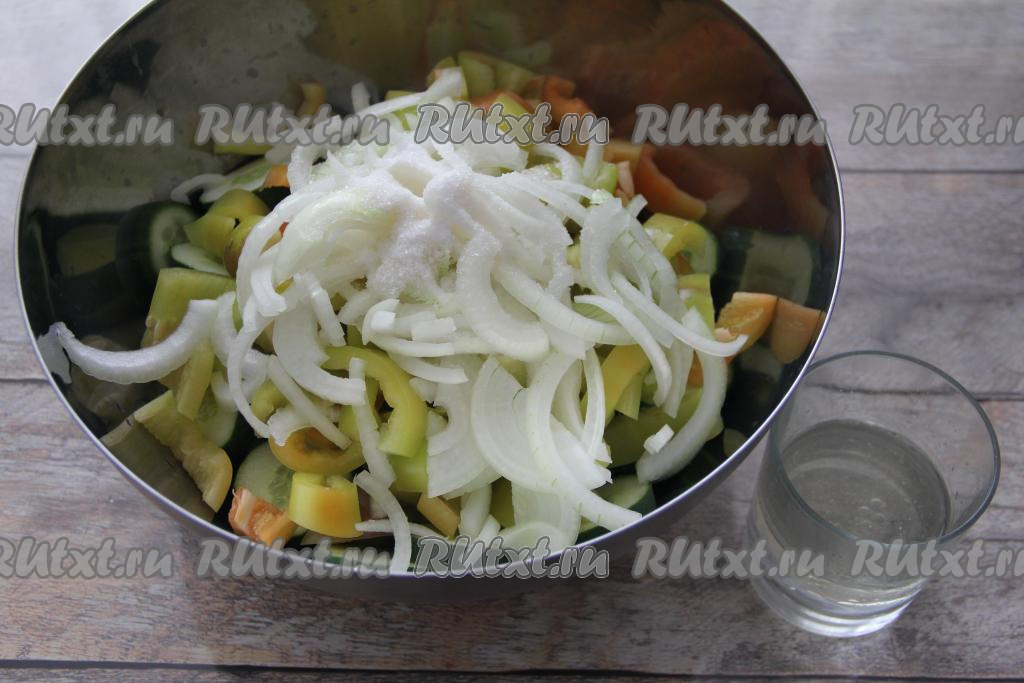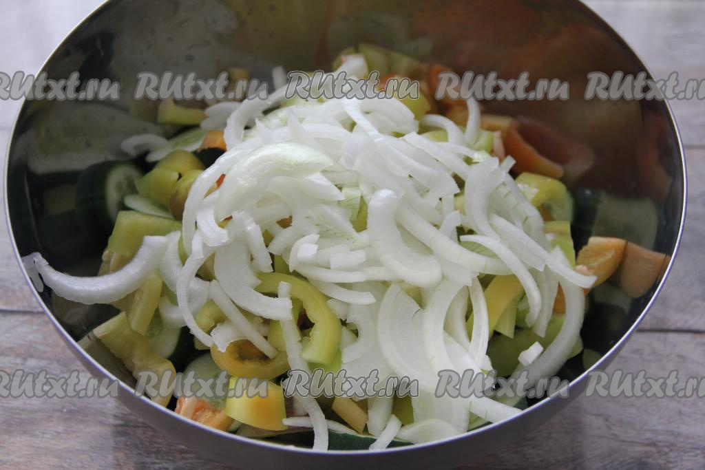 Лук нарезать полукольцами и выложить в миску с перцем и огурцами.