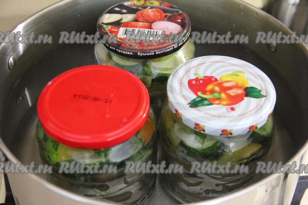 Периодически перемешивать овощи, они дадут сок. Банки простерилизовать любым удобным способом (например, над паром или в микроволновке), крышки с момента закипания воды прокипятить в течение 3-5 минут.