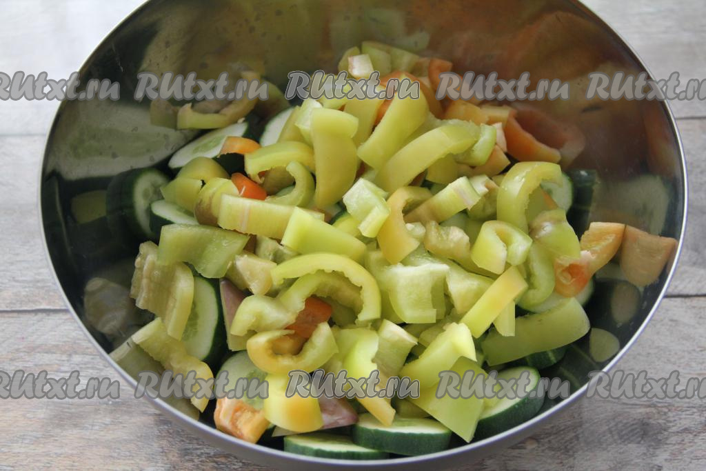 Перец очистить от семечек и плодоножек, нарезать на полоски и переложить к огурцам.