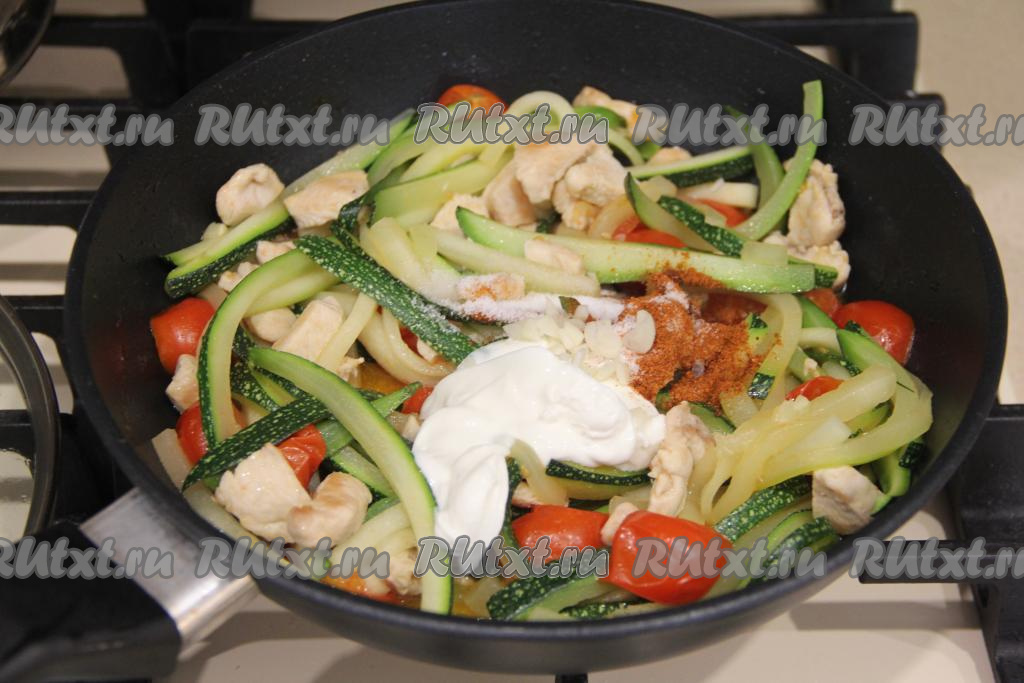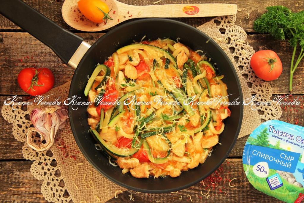 Предлагаю потушить в сметане на сковороде кабачки с куриным филе и помидорами. Блюдо готовится очень просто и быстро. Кабачки, тушёные с куриным мясом и помидорами, можно подать и к обеду, и к ужину. Всем советую рецепт этого аппетитного, сочного и нежного блюда!