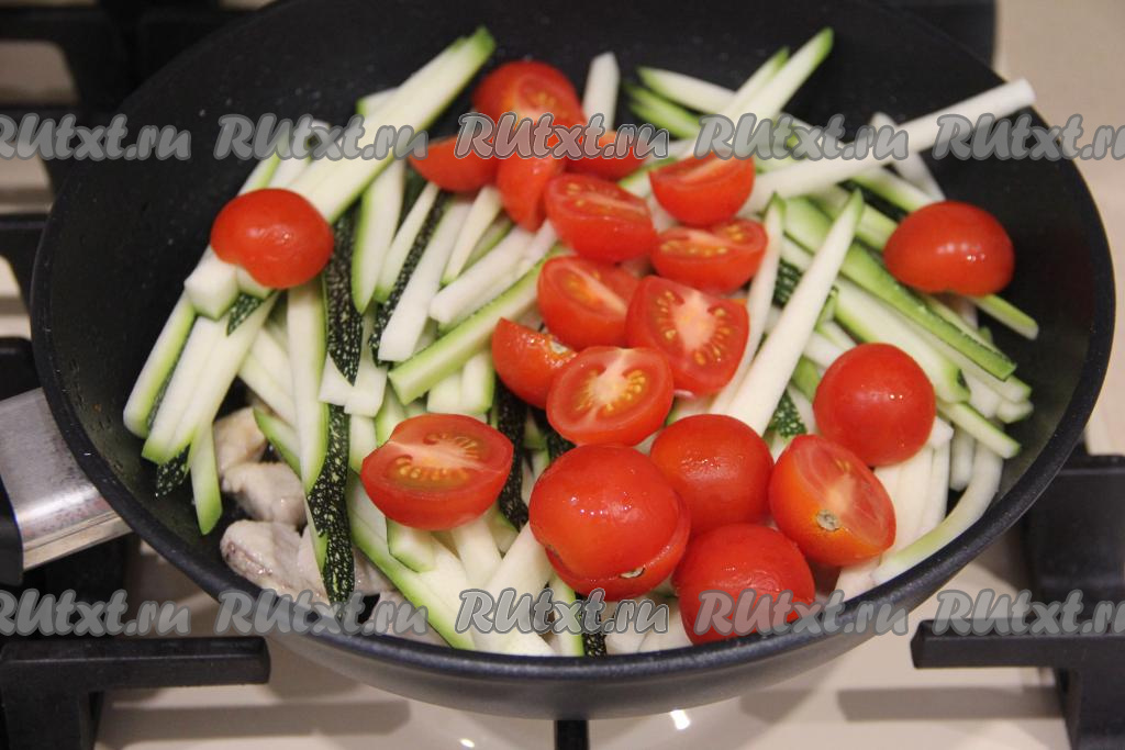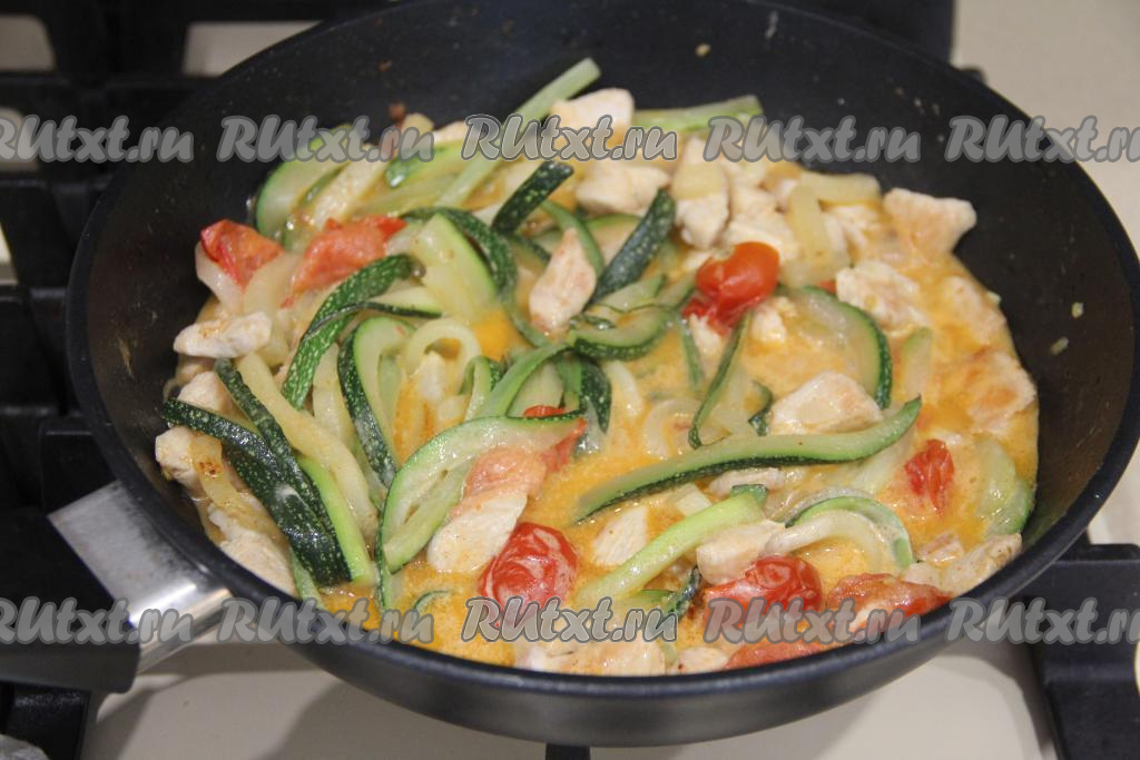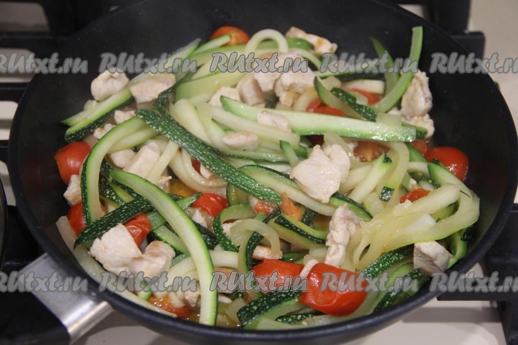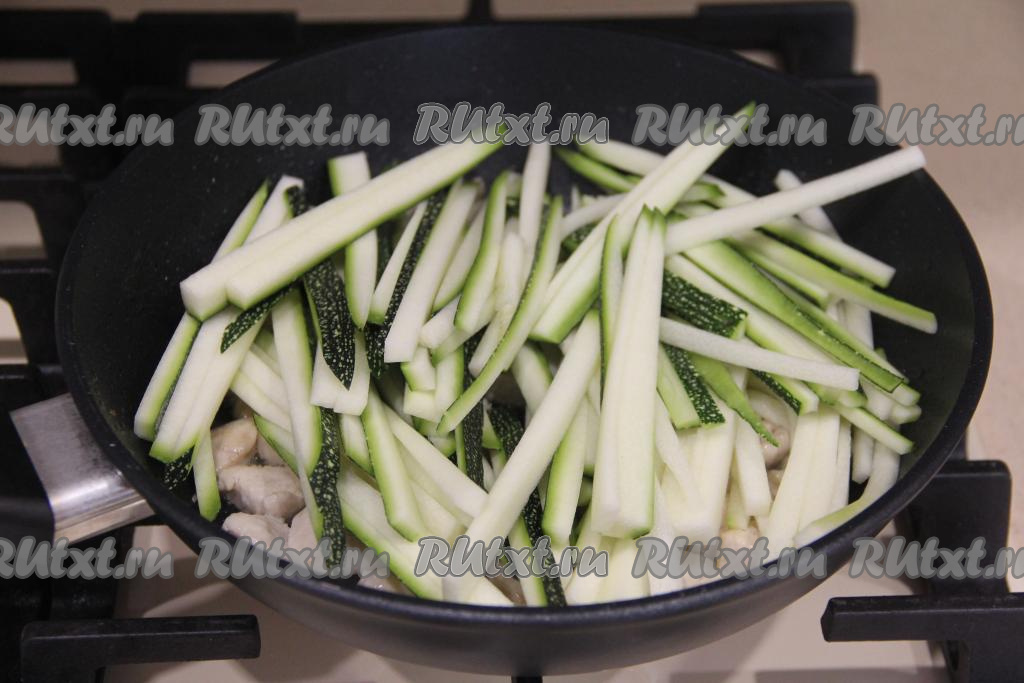 Кабачок нарезать на длинные, тонкие брусочки, а затем выложить в сковороду с обжаренной курицей.
