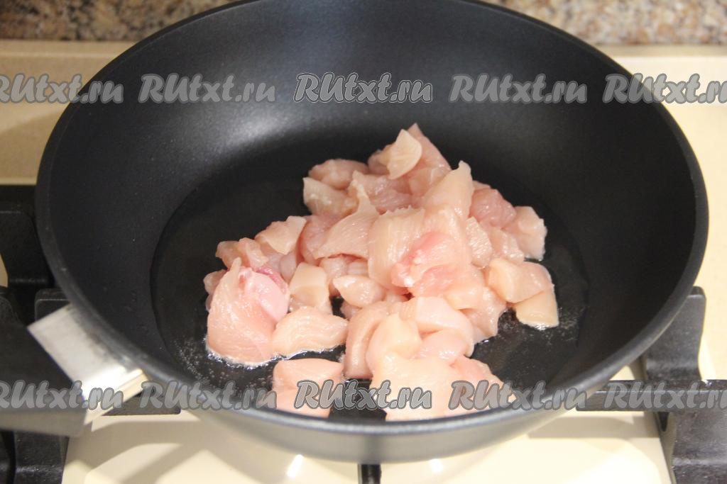 В сковороду влить масло, разогреть его и выложить куриное филе, нарезанное на средние кусочки.