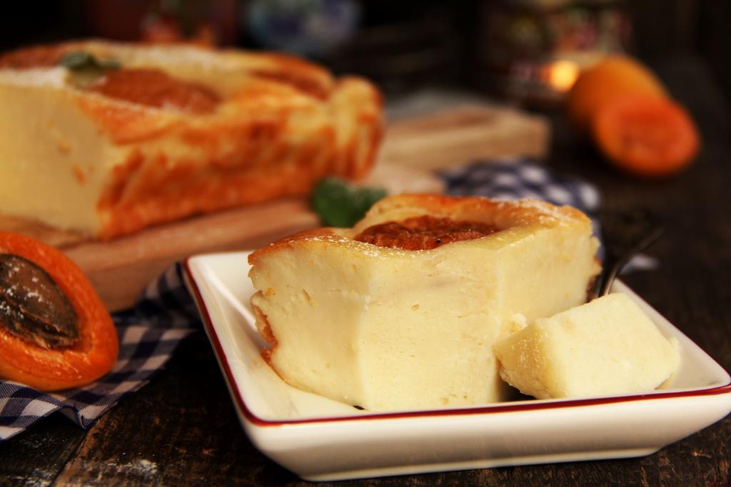 Готовую вкусную, воздушную творожную запеканку с абрикосами достать из духовки, слегка остудить, а затем извлечь из формы, нарезать на кусочки и подать к столу.