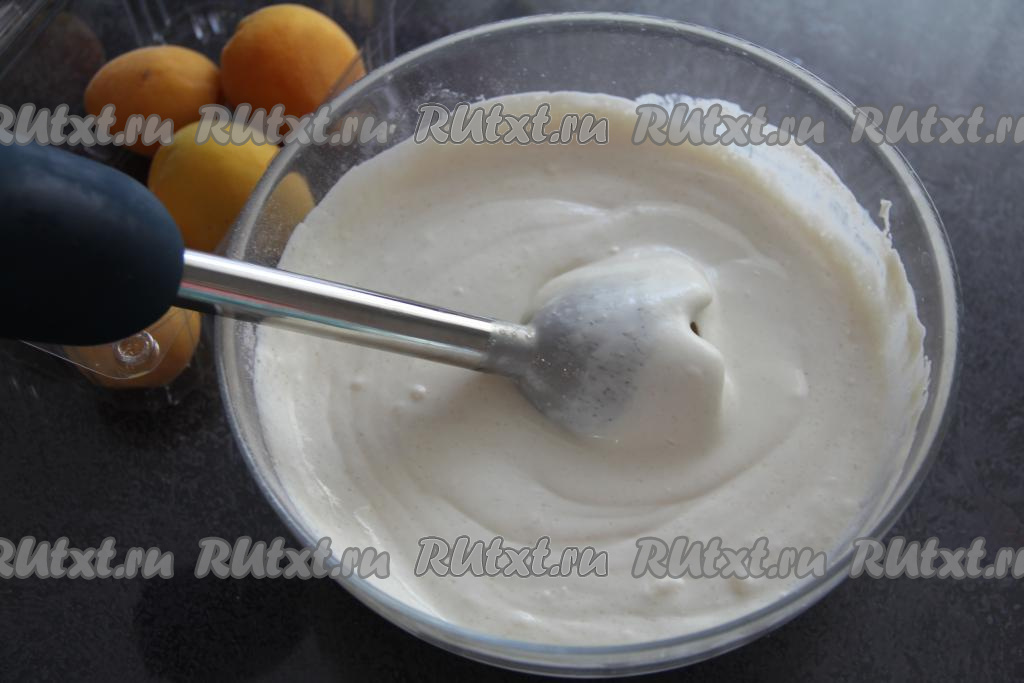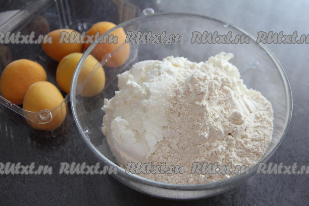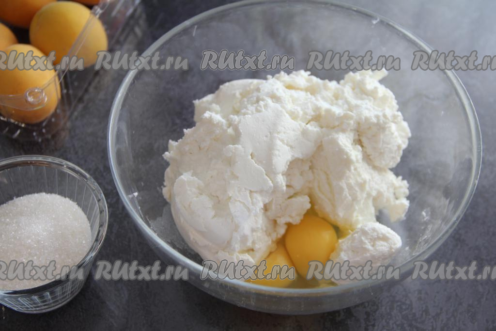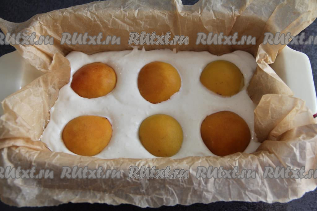 Форму для выпекания (я взяла прямоугольную форму размером 28 сантиметров на 15 сантиметров) застелить пергаментом и выложить творожную массу. Абрикосы разрезать на две части и удалить косточки. Выложить абрикосы поверх творожной массы срезом вниз и слегка их вдавить.