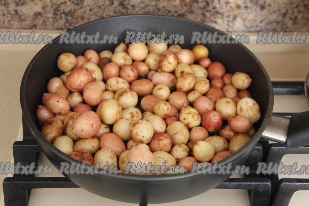В сковороду влить масло и хорошо разогреть. Добавить подготовленную молодую картошку целиком в сковороду. Обязательно убедитесь, что картошка обсохла, лишняя жидкость при жарке не нужна.