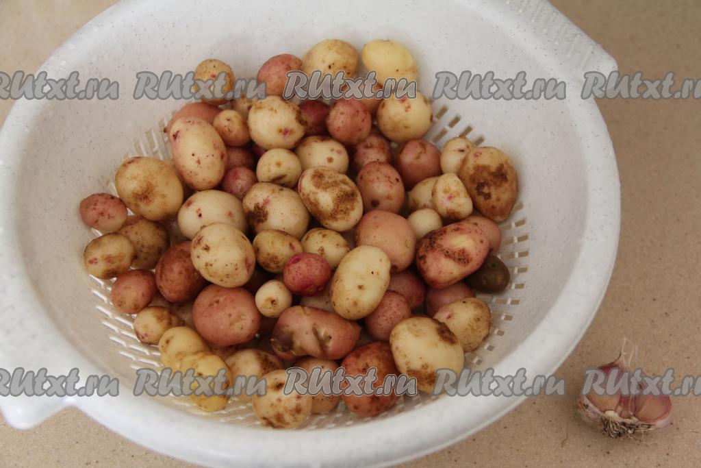 Мелкий молодой картофель тщательно промыть, удаляя загрязнения с помощью железной щётки. У молодой картошки тонкая шкурочка, которую можно не срезать, достаточно будет поскрести её щёткой и промыть водой. Подготовленный картофель переложить в дуршлаг, чтобы удалить жидкость.